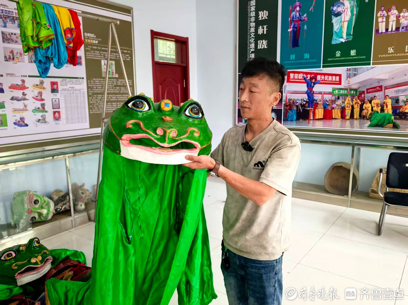 百兽图和独杆跷的道具制作,体现了老一辈人的智慧。金蟾的头罩制作工艺复杂,需要先拿竹篾扎出大致形状,再用泥巴糊成泥胎,接着把废纸、破报纸、烂纸壳放进大锅里,加花椒水煮成纸浆,这样既能防蛀,又能让纸浆更黏,随后将纸浆一层一层往泥胎上抹,晾干后上色,一个活灵活现的金蟾头罩才算完成。