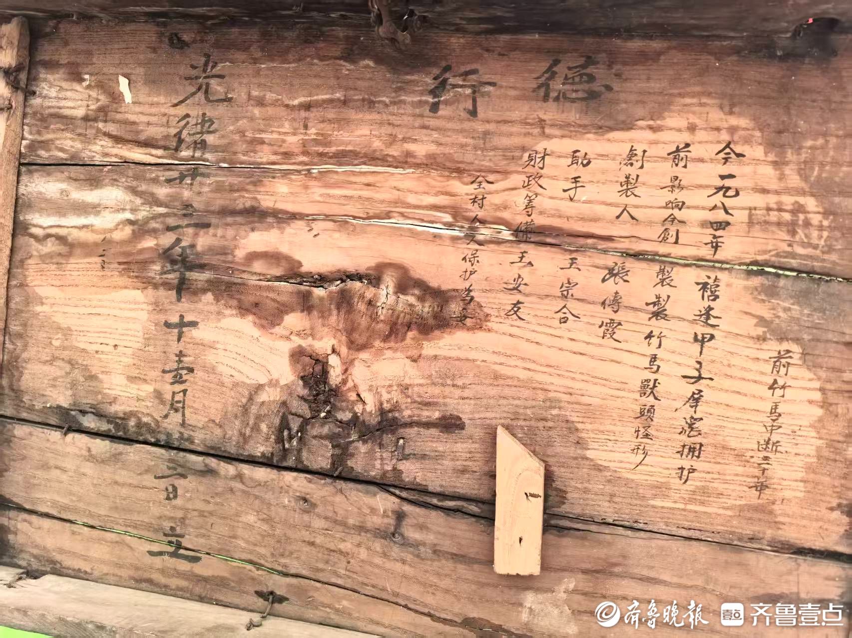 掀开箱盖,内侧的墨字虽被时光浸得有些淡,却依旧能看清笔画走势:左侧“光绪廿三年十壹月廿三日 立”笔锋遒劲。右侧记录的字迹风格不同,笔画间藏着工整,提及“前竹馬中断三十年 今一九八四年 禧逢甲子 羣衆拥护”,还标注了创制人、助手与财政筹备者,末尾“全村人人保护為妥”的字样,足见这门技艺当年在村里的珍贵程度。最顶端还有两个字,“有人说这俩字应该从左往右念‘行德’,也有老辈人说该读‘德行’,不管怎么说,都是我们村里人对这门技艺的尊重。”张波说。