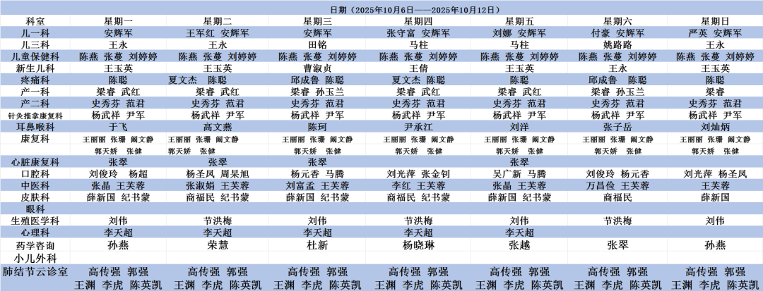 线上诊疗流程请点击此处: 新泰市人民医院互联网医院线上诊疗流程儿科、产科、五官科、眼科、生殖医学科、急诊科、皮肤科、疼痛科、康复科等科室排班表(点击排班表图片可放大查看)