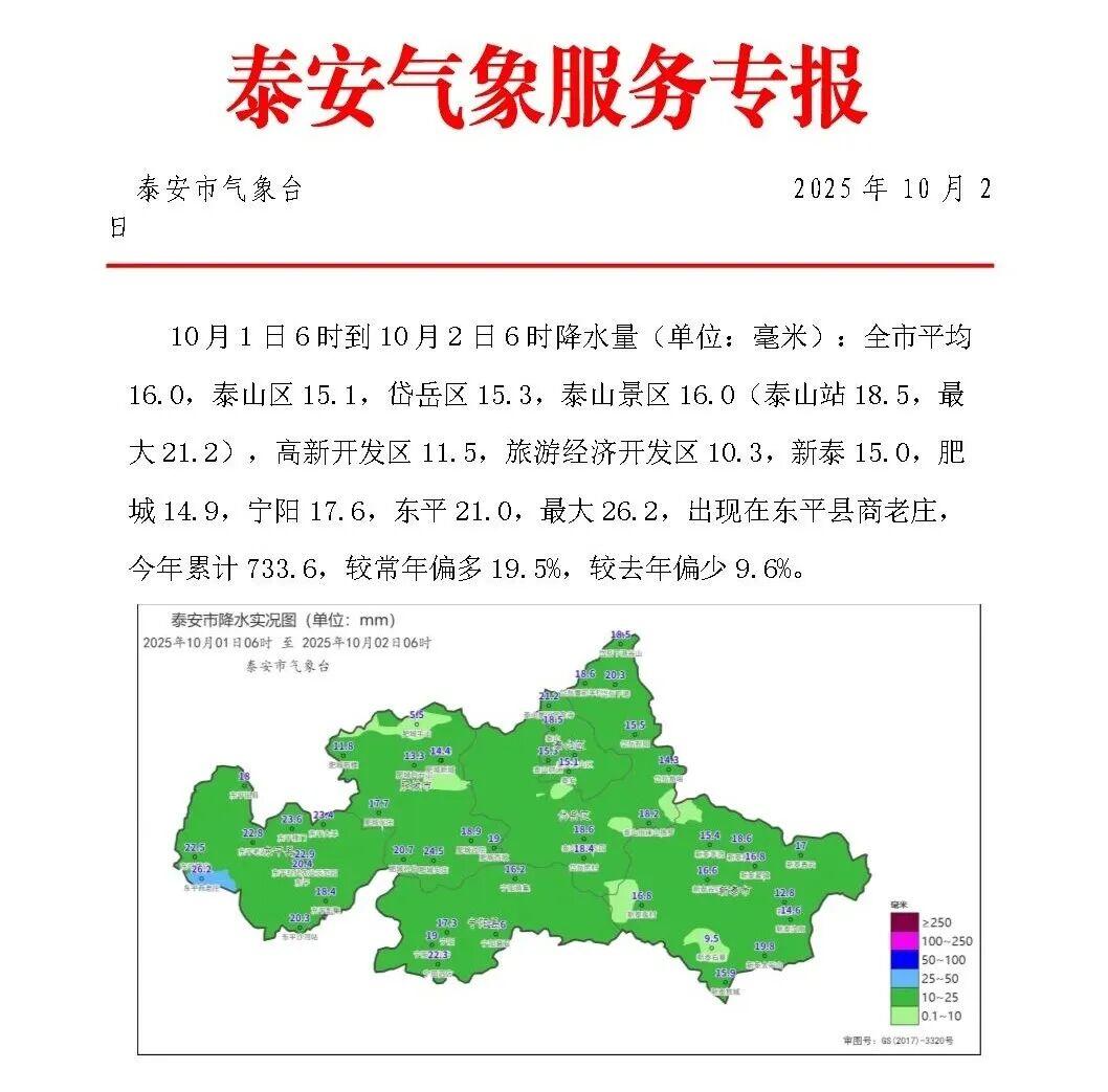 10月2日,泰安市气象台发布《气象服务专报》及未来七天天气预报,详细通报近期降水实况与后续天气趋势。