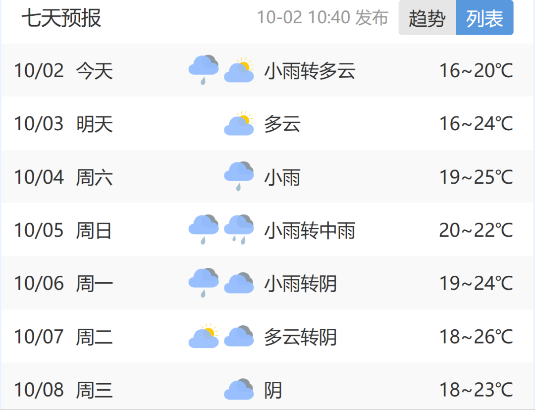 10月2日(今天):小雨转多云,气温16~20℃;