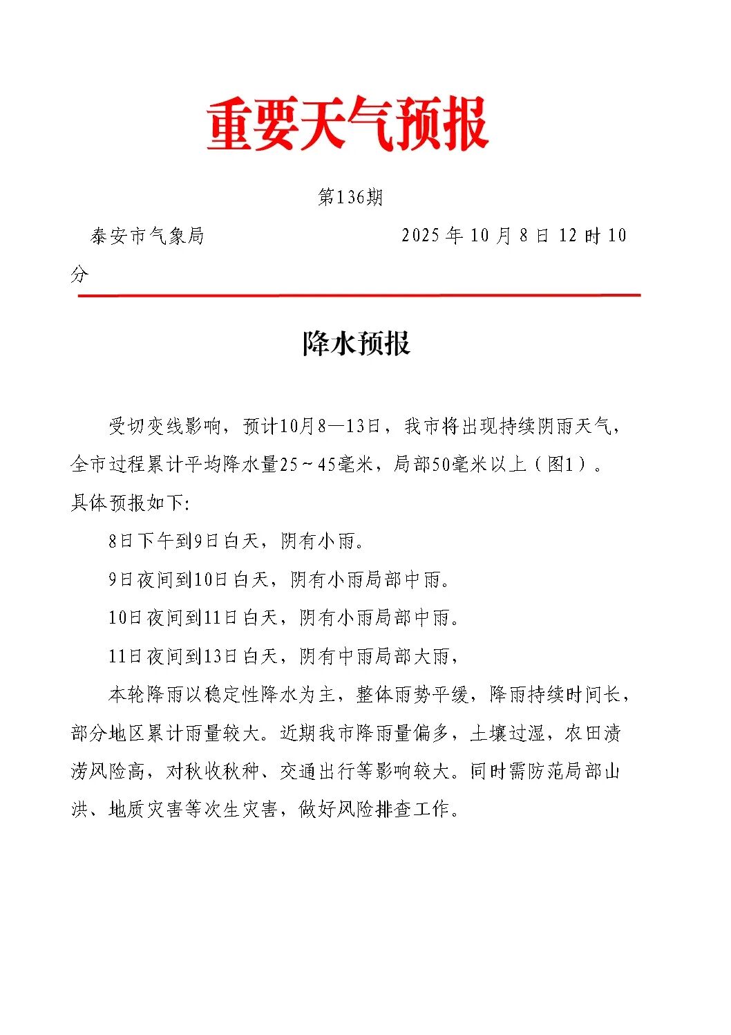 受切变线影响,预计10月8—13日,我市将出现持续阴雨天气,全市过程累计平均降水量25~45毫米,局部50毫米以上(图1)。具体预报如下: