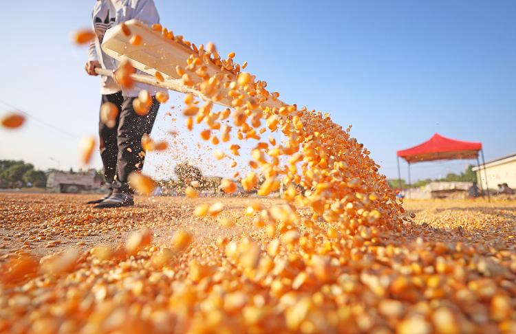 10月9日,山东临沂,郯城县郯城街道农民晾晒收获的玉米