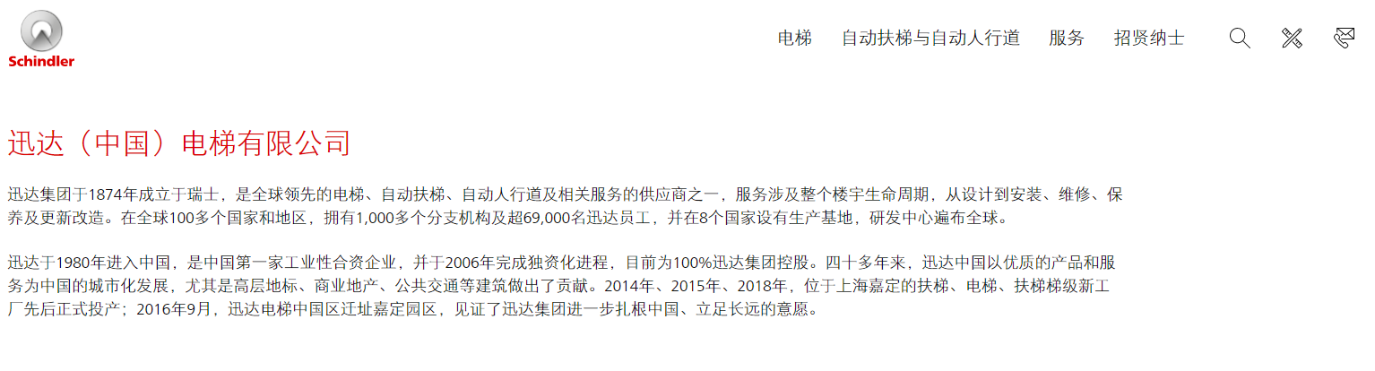 据迅达电梯官网介绍,迅达集团于1874年成立于瑞士,是全球领先的电梯、自动扶梯、自动人行道及相关服务的供应商之一,服务涉及整个楼宇生命周期,从设计到安装、维修、保养及更新改造。在全球100多个国家和地区,拥有1,000多个分支机构及超69,000名迅达员工,并在8个国家设有生产基地,研发中心遍布全球。迅达于1980年进入中国,是中国第一家工业性合资企业,并于2006年完成独资化进程,目前为100%迅达集团控股。