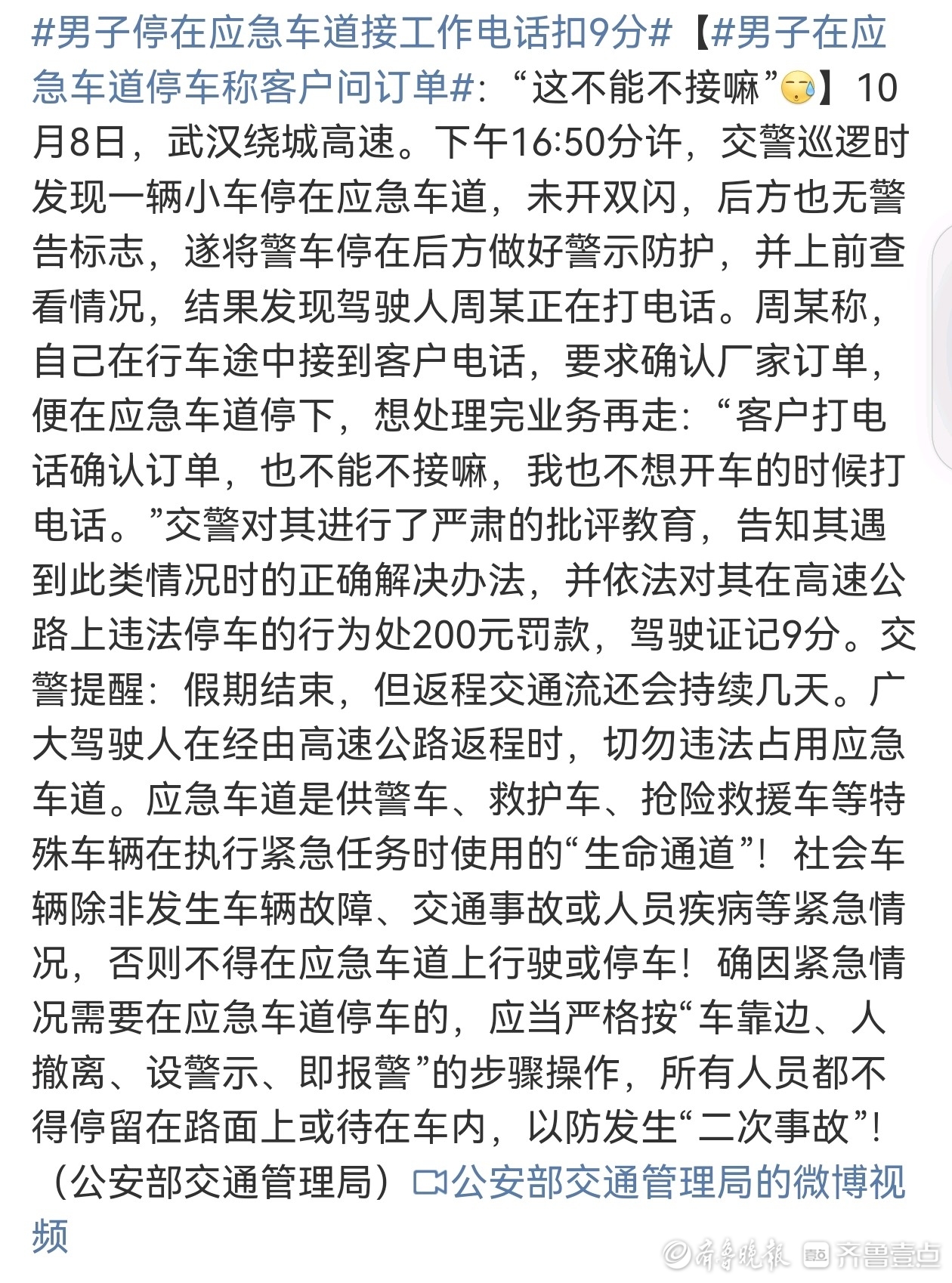 “客户打电话确认订单,也不能不接嘛。”10月8日16时50分许,武汉绕城高速上,驾驶人周某因接客户电话确认厂家订单,将小车停在应急车道且未开双闪、未设警示标志,被巡逻交警依法处200元罚款、驾驶证记9分。此事引发热议:应急车道啥样的算应急情况,是什么定义?适应新形势是不是应该拓展一下应急适用情形?针对这些疑问,专业律师结合法规与案例,进行了专业解读。