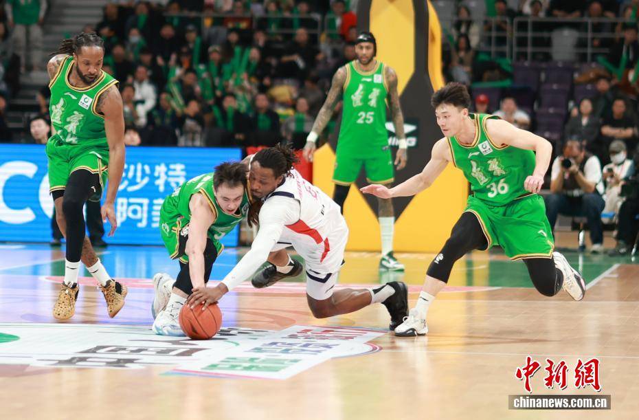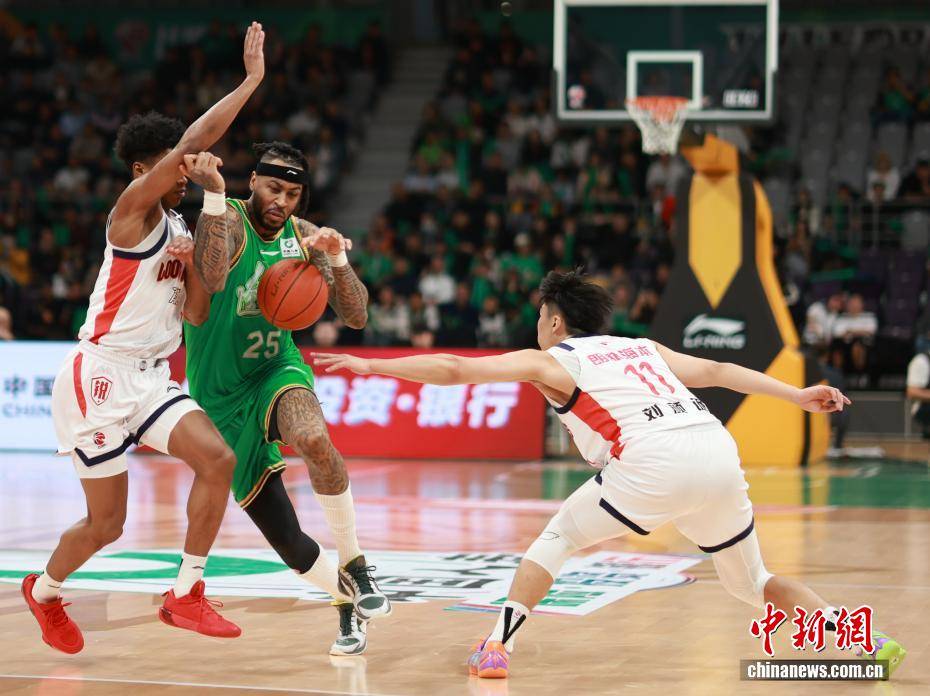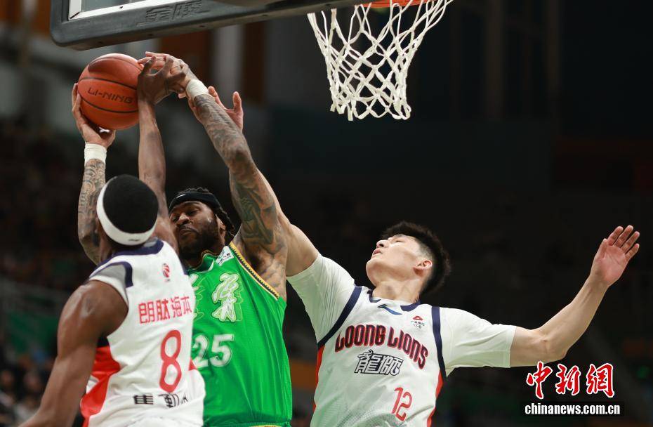 3月18日,在辽宁沈阳举行的2025-2026赛季中国男子篮球职业联赛(CBA)常规赛第27轮比赛中,辽宁本钢队主场以97比86战胜广州朗肽海本队。图为辽宁本钢队球员莫兰德(中)在比赛中拼抢。中新社记者 于海洋 摄