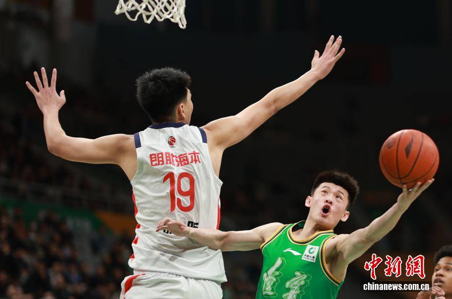 3月18日,在辽宁沈阳举行的2025-2026赛季中国男子篮球职业联赛(CBA)常规赛第27轮比赛中,辽宁本钢队主场以97比86战胜广州朗肽海本队。图为辽宁本钢队球员王岚嵚(右)在比赛中上篮。中新社记者 于海洋 摄