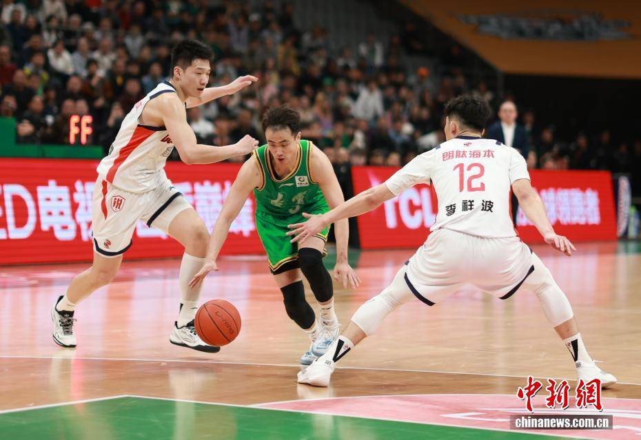 3月18日,在辽宁沈阳举行的2025-2026赛季中国男子篮球职业联赛(CBA)常规赛第27轮比赛中,辽宁本钢队主场以97比86战胜广州朗肽海本队。图为辽宁本钢队球员赵继伟(中)在比赛中带球进攻。中新社记者 于海洋 摄