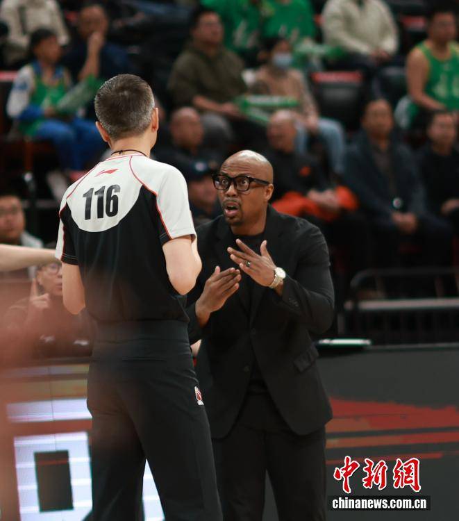 3月18日,在辽宁沈阳举行的2025-2026赛季中国男子篮球职业联赛(CBA)常规赛第27轮比赛中,辽宁本钢队主场以97比86战胜广州朗肽海本队。图为广州朗肽海本队主教练米切尔在与裁判交流。中新社记者 于海洋 摄